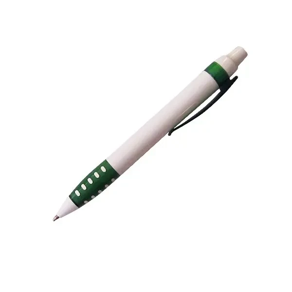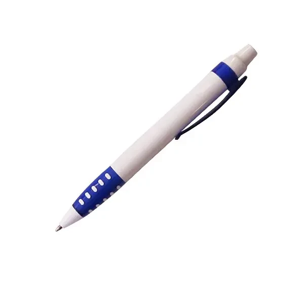 Plástico. Cuerpo blanco mate. Clip, puntera y pulsador color plata. Debajo del clip detalle de color. Tinta azul.